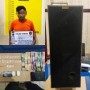 Satu pelaku menggunakan baju tahanan berwarna oranye dengan papan bertulis “tersangka” yang dikalungkan.