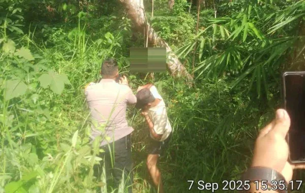 Bengkalis, Rakyat45.com – Warga Wonosari di gegerkan penemuan sosok mayat tergantung pohon Karet di Jalan HR Subrantas, Gang Suryan, RT 002 RW 008 Desa Wonosari, Kecamatan Bengkalis, Minggu, 7 September 2025, tentu ini sangat mengejutkan masyarakat sekitar.