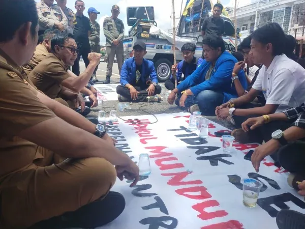 Sedangkan, Sekda dan rombongan yang dipaksa duduk di aspal untuk berdialog. Bahkan dialog yang berlangsung panas tersebut, mahasiswa yang sejak awal ingin menjumpai Bupati, namun tak kunjung datang, akhirnya mahasiswa meminta ke sekda agar bupati menemuinya.
