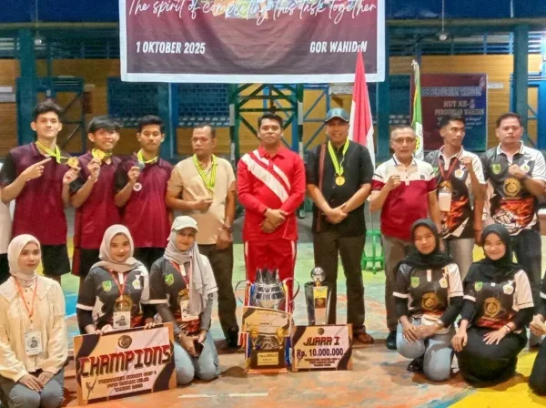 Rohil, Rakyat45.com – Turnamen Sepak Takraw Piala Bupati Cup I resmi berakhir dengan laga final yang mempertemukan Bangko Pusako melawan Pujud Perkasa di GOR Wahidin, Jum’at sore (3/10/2025). Pertandingan berlangsung seru dan mendapat sorakan meriah dari ratusan penonton yang memadati arena.