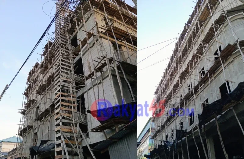Yang lebih mencemaskan, struktur perancah (scaffolding) yang digunakan di lokasi tampak terbuat dari kayu mahang bekas, bukan material baja sesuai standar bangunan bertingkat.