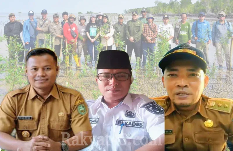 Teks foto ; Penjabat kepada Desa Kembung Baru Sugeng Raharjo S.Pd.I, Pj Kepala Desa Teluk Pambang, Sariyono, dan Kepala Desa Kembung Luar, Jamaludin serta Background photo memperlihatkan kegiatan lapangan penanaman mangrove yang melibatkan pemerintah desa, masyarakat, dan tim YKAN di kawasan pesisir Bantan, Kabupaten Bengkalis. Foto di edit/R45/In. Selasa, (21/10/2025).