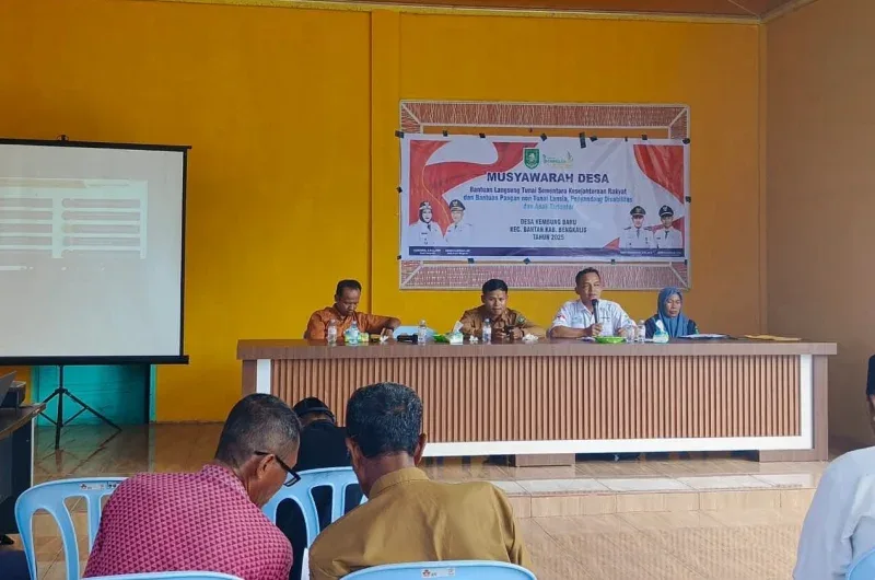 Bantan, Rakyat45.com – Pemerintah Desa (Pemdes) Kembung Baru kembali melaksanakan Musyawarah Desa (Musdes) bersama pendamping desa dan masyarakat guna membahas penyaluran Bantuan Langsung Tunai Sementara Kesejahteraan Masyarakat (BLT-SKM) serta Bantuan Pangan Non-Tunai (BPNT) bagi lansia, penyandang disabilitas, dan anak terlantar.