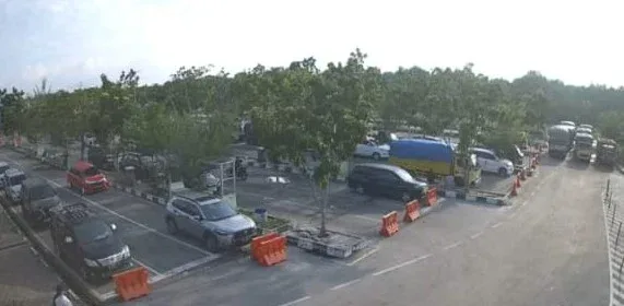 Teks foto: Antrean kendaraan roda empat tampak memadati kawasan keberangkatan Dermaga RoRo Air Putih, Bengkalis, foto diambil melalui rekaman CCTV Dishub Bengkalis, Minggu, (30/11/2025),R45/Indra.