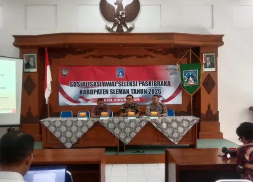 Sleman, Rakyat45.com – Menyongsong tahapan pendaftaran Calon Pasukan Pengibar Bendera Pusaka (Paskibraka) Tahun 2026, Badan Kesatuan Bangsa dan Politik (Kesbangpol) Kabupaten Sleman menggelar kegiatan sosialisasi pembentukan Paskibraka Kabupaten Sleman Tahun 2025. Kegiatan ini berlangsung di Aula Unit I Kompleks Pemerintah Kabupaten Sleman, Selasa (16/12/2025).