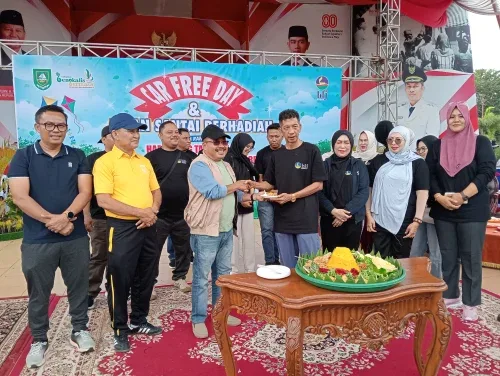 Teks Foto: Komisaris Utama PT Bumi Laksamana Jaya (Persoda) Heri Indra Putra menyerahkan hadiah kepada peserta Jalan Santai Berhadiah dalam rangka peringatan HUT ke-24 PT BLJ pada kegiatan Car Free Day di Lapangan Tugu Bengkalis, Minggu (21/12/2025)/R45/Indra.