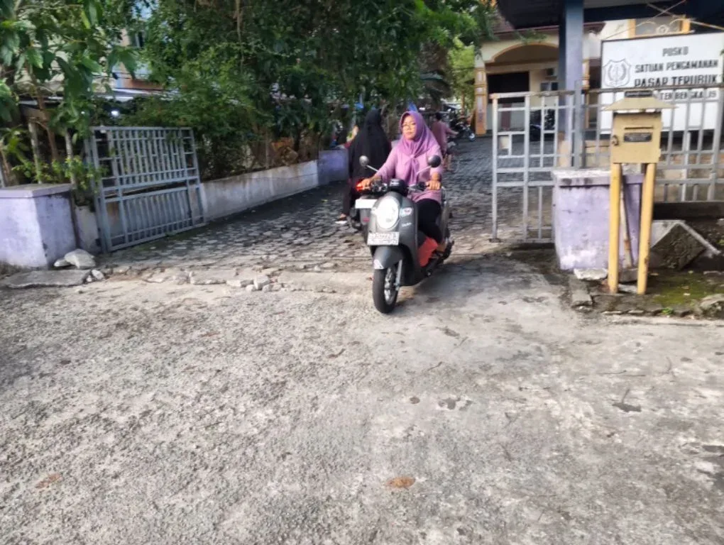 Pantauan pada Selasa (24/2/2026) memperlihatkan kondisi jalan masuk dan keluar pasar dalam keadaan rusak. Permukaan yang tidak rata menyulitkan kendaraan roda dua maupun pejalan kaki. Bagi pengunjung yang datang membawa kebutuhan belanja, risiko tergelincir atau terjatuh menjadi ancaman nyata, terutama saat hujan mengguyur.