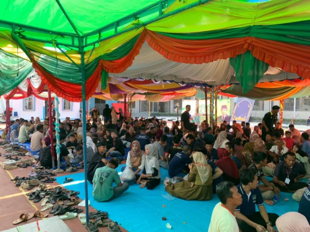 Ribuan pengunjung memadati lapangan serbaguna Lapas Kelas IIA Bengkalis pada hari kedua Idulfitri 1447 H, bagian dari lonjakan kunjungan yang mencapai 2.385 orang, saat keluarga melepas rindu dengan warga binaan, Minggu (22/03/2026)./R45/Humas.
