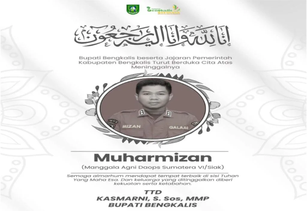 Almarhum Muharmizan adalah anggota Manggala Agni Daops Siak, yang sejak pagi hingga sore hari tanpa lelah berjuang memadamkan kobaran api di wilayah Kabupaten Bengkalis. Keteguhan dan dedikasinya menjadi teladan nyata pengorbanan demi keselamatan masyarakat dan kelestarian alam.